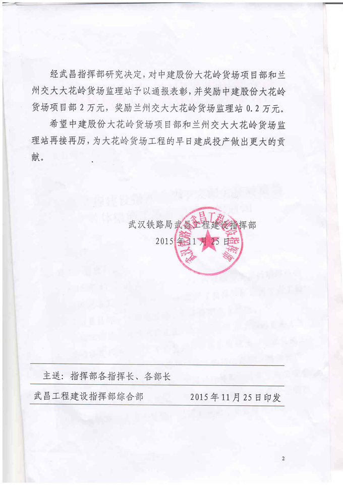 我公司武黄城际监理站大花岭货场转体梁施工获业主表彰