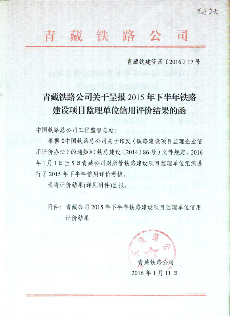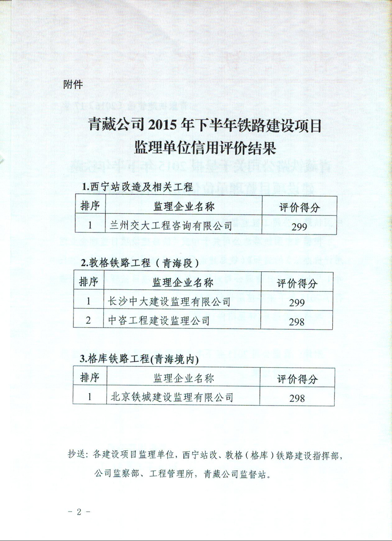 我西宁枢纽监理站在青藏铁路公司2015年下半年信用评价考核中获得299分的好成绩。