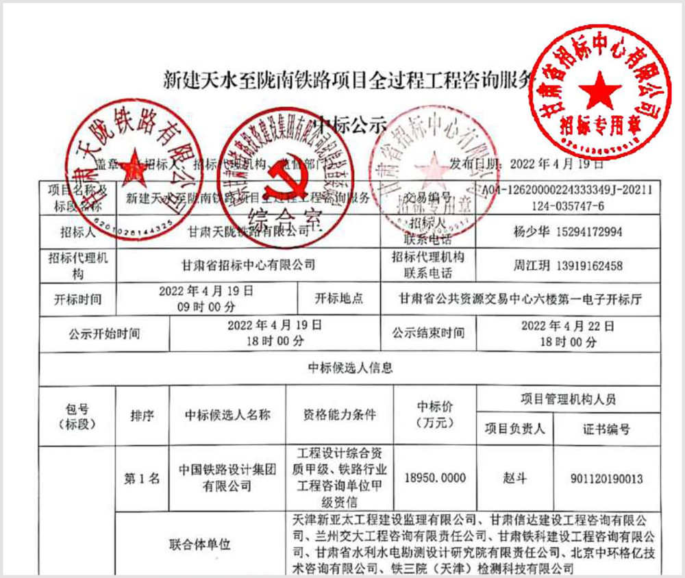2022年4月22日中标公示期结束,公司参与的投标联合体成功中标新建天水至陇南铁路项目全过程工程咨询服务。
